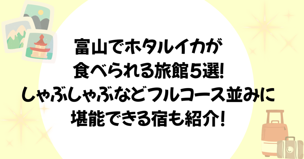 富山でホタルイカが食べられる旅館について紹介します。こんなお悩みありませんか? お悩み 富山名物のホタルイカを旅館の食事で味わいたい ホタルイカをしゃぶしゃぶやお刺身などフルコース並みに楽しみたい 富山でホタルイカすくいをして、さらにホタル... 宿