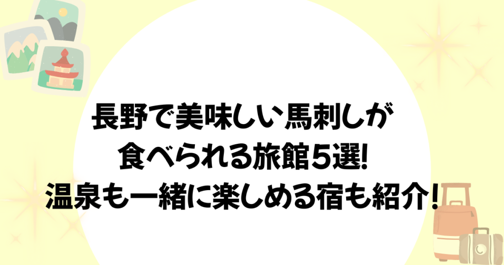 お悩み 長野で馬刺しが食べられる宿を知りたい 温泉も料理も満足できる宿を探してる。 そこで今回は、長野で美味しい馬刺しが食べられる旅館を紹介します! 長野で美味しい馬刺しが食べられるおすすめ旅館5選 鹿乃屋旅館 たてしな藍 蔵造りの宿 東石川旅館 ... -